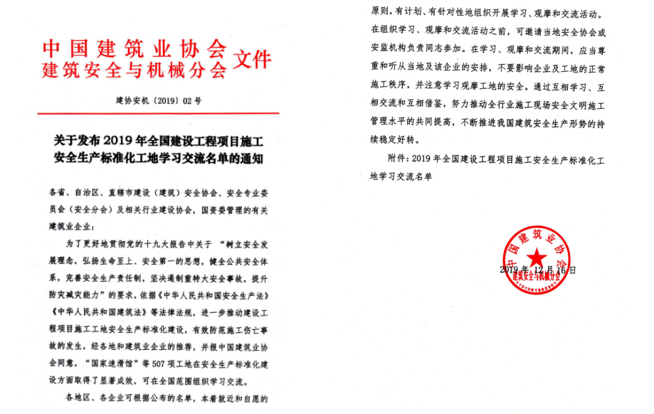 2019年,公司共建设天下建设工程项目施工清静生产标准化工地1个,省级清静生产标准化树模工地8个,市级清静生产标准化树模工地8个,集团公司清静文明标准化树模工地10个,建设项目数目再创历史新高,突破了6年来国家级树模工地及省外项目省级树模工地零的突破。