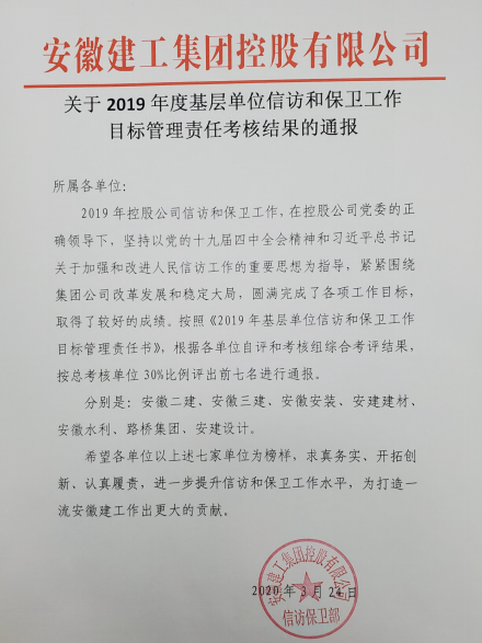 安徽二建公司获集团2019年度信访守卫审核第一名