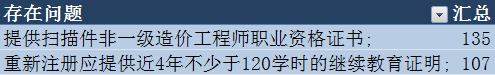通太过析不切合条件职员的问题发明,保存“提供扫描件非一级造价工程师职业资格证书”、“重新注册应提供近4年不少于120学时的继续教育证实”这两大问题的职员较多,划分为135人和107人,占所有不切合初始注册条件人数的49.2% 。